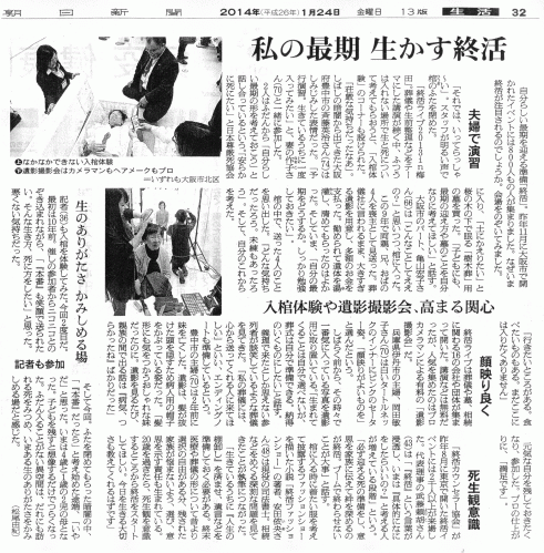 ヤシロ終活サポートの為房です。 2014年1月24日 朝日新聞・生活面に 昨年11月22日に開催いたしました、 終活ライブin梅田2013の様子が掲載されました。 これからも、関西の終活情報を発信したいと思います。